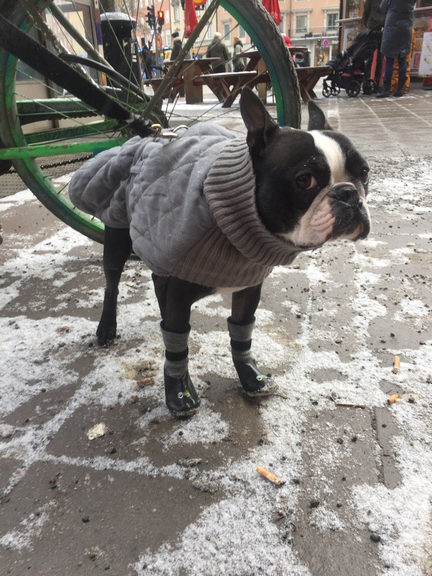 But please, look at the picture of my Boston Terrier & constant companion, Ellert. His whole posture and gaze tell me, very loud and clear, that he hates me a little right there and then. The reason? Boots and coat! It’s bad enough that I occasionally force him to wear the sweater when it’s too cold and wet. But the boots…that’s the ultimate humiliation, it seems.